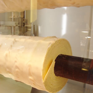 用来烘烤年轮蛋糕的,是搁置在火上且不断旋转的一根铁棒,铁棒下面是燃烧的火焰。必须把年轮蛋糕的原胚调制好后,才能把它慢慢地浇在铁棒上,使其成为一层薄薄的皮。等这层皮烤熟之后,才能再浇第二层蛋糕胚料。这样的蛋糕层至少得烤上数十片,因此制作一个年轮蛋糕就需要很长的时间。