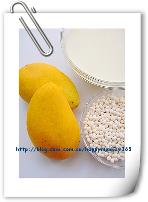 【原料】芒果2个,西米200g,牛奶450ml,另准备凉开水一碗