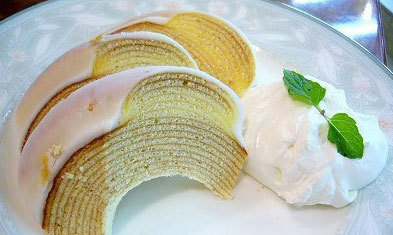 传说中的蛋糕之王Baumuchen,直译即为“年轮蛋糕”。这种看似树木年轮的蛋糕是欧洲多个国家的知名点心,是一种多层蛋糕。当对其作横断切开时,年轮蛋糕呈现了特征性的金色环圈,而使之得“年轮”之名——Baumkuchen。一般的蛋糕虽然好吃,但是软绵绵的面粉粉状口感容易让人生厌和口干,而这种一层一层的蛋糕,虽然松软却不会有面粉粉状口感,嚼起来没有口干的感觉,口感很棒!