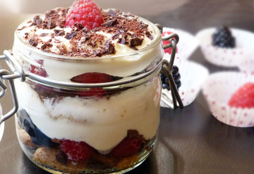 4.取四个玻璃杯,把手指饼干迅速地在咖啡甜酒中浸一下,每个玻璃杯中放入三块手指饼干,铺上一层覆盆子和黑莓,撒上巧克力碎,倒入一半的芝士蛋黄溶液。再摆上另外三块饼干,放上覆盆子和黑莓,撒上巧克力,倒上剩下的芝士蛋黄溶液。最后在用剩下的巧克力碎和覆盆子装点每个被子,放入冰箱冷藏至少2小时。