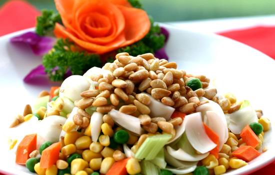 松子清肠润肌肤:珍珠般的松子,在传统御膳中运用广泛,向来被视为有滋补强身功效。松子丰富的油脂成份,不但可以帮助排便,还可以滋润皮肤。