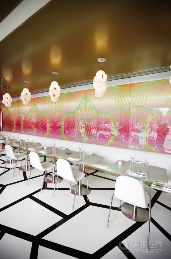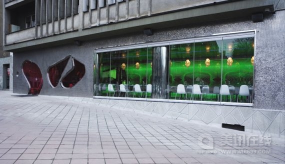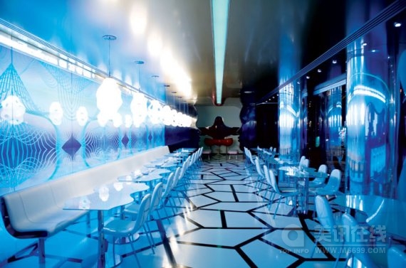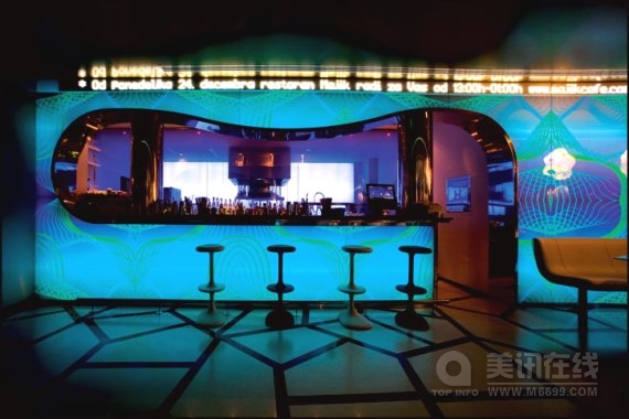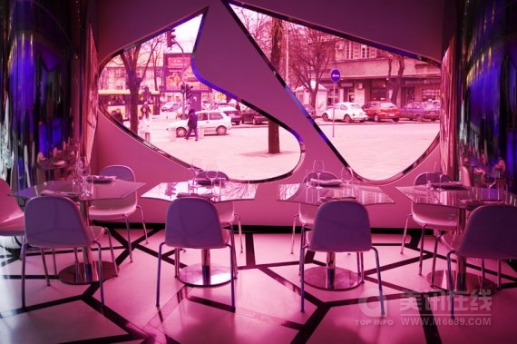 魔法咖啡屋(Majik Cafe)位于塞尔维亚贝尔格莱德,其室内空间是由美国未来型家居设计界巨星凯瑞姆.瑞席(Karim Rashid)设计的。明亮大胆的构造与颜色是对共产主义时期的野兽派沉闷的灰色建筑的强烈视觉冲击,海啸式的形状与颜色在室内产生了爆炸效应,是瑞席从数码设备上获得的灵感。