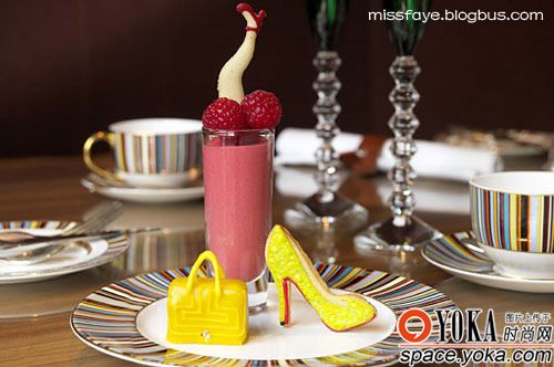 所有甜点的灵感都来自T台上的霓裳艳影。如上图所示,香蕉蛋糕被做成了Smythson“Maze Bag”,女人们至爱的红底鞋也位列在餐盘。