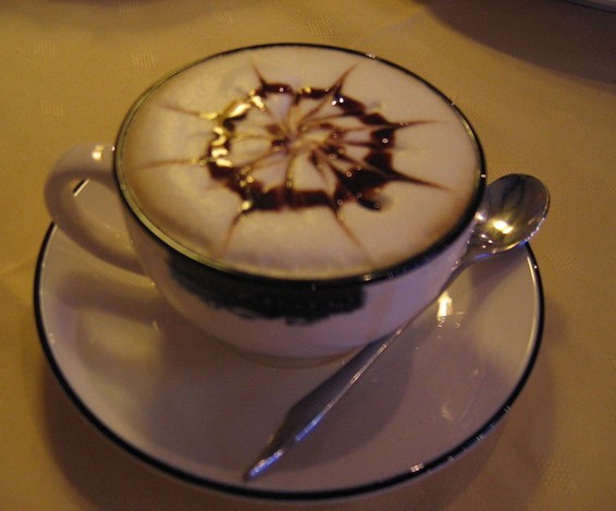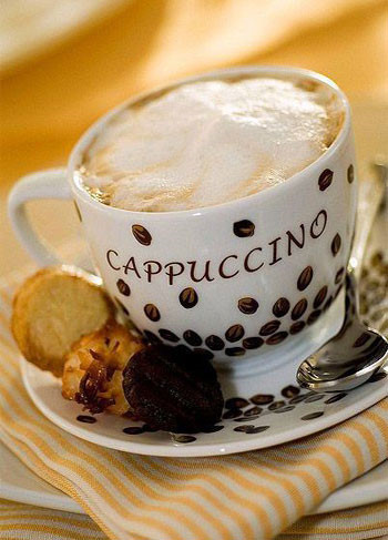 3、卡布奇诺(Cappuccino)。爱就象CAPPUCCINO。。。。歌中这样唱到。而什么是CAPPUCCINO呢?翻译过来就是奶沫咖啡。先做一份ESPRESSO,再用蒸汽喷蒸牛奶打出奶泡,然后将热蒸奶倒入咖啡杯,最后将奶泡轻拨在咖啡杯的最上面。喝这种咖啡嘴边或多或少的会沾上一些白色的奶沫,如果说ESPRESSO是男人,那CAPPUCCINO就是爱情,它是ESPRESSO与柔美女人(奶沫)的完美结合。柔中有刚,刚中有柔。
