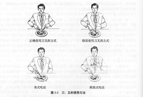 西方人用餐,餐桌上必须使用餐巾,一般家庭均用与桌布同套的餐巾,或抽沙,或刺绣,力求美观大方。餐巾务必洗净熨平,折后置放于餐盘中。使用刀叉进餐时,从外侧往内侧取用刀叉,要左手持叉,右手持刀;切东西时左手拿叉按住食物,右手执刀将其锯切成小块,然后用叉子送入口中。使用刀时,刀刃不可向外。进餐中放下刀叉时,应摆成“八”字型,分别放在餐盘边上。刀刃朝向自身,表示还要继续吃。每吃完一道菜,将刀叉并拢放在盘中。如果是谈话,可以拿着刀叉,无需放下。不用刀时,也可以用右手持叉,但若需要作手势时,就应放下刀叉,千万不可手执刀叉在空中挥舞摇晃,也不要一手拿刀或叉,而另一只手拿餐巾擦嘴,也不可一手拿酒杯,另一只手拿叉取菜。要记住,任何时候,都不可将刀叉的一端放在盘上,另一端放在桌上。每次送入口中的食物不宜过多,在咀嚼时不要说话,更不可主动与人谈话。