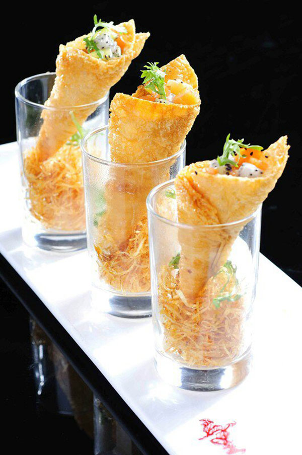 眼下许多意境菜,受西方传统绘画的影响,其菜品的装盘艺术也有许多线条、圆点的元素。意境菜很重要的一点就是造型更加灵动、富有变化,巧妙的处理空白、疏密之间的关系。通过创新和想象提高菜品的品味,从而把菜做得有生命,从而满足食客的品味需求。“意境菜现在还是个很新鲜的词,我觉得它更像是一中以食物的表演艺术,从视觉味觉上都令人耳一新。意境菜中可包容日式餐饮的精美,也有西式餐饮的优雅,还有中餐的好口味。