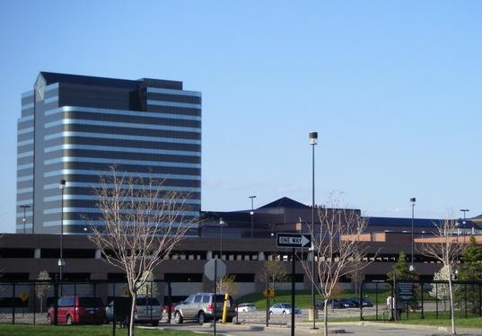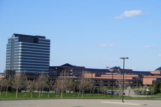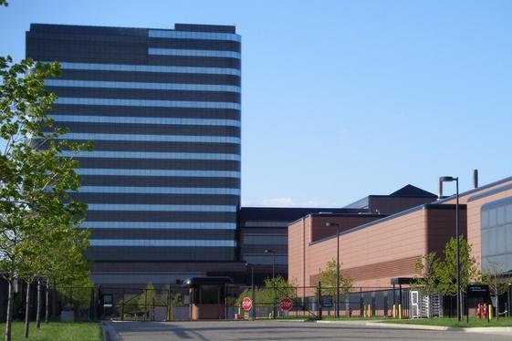 这是紧贴主楼的侧楼,楼前有一个入口,不能随便进。位于底特律市中小的通用汽车公司总部就好多了,楼下几层对外开放,人们可以随便进的。只有坐电梯往上走去办公地点时,得划磁卡,电梯才能动。一般人没卡自然就上不去