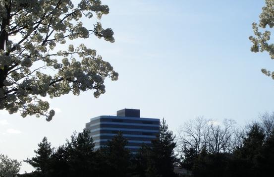 主楼在花木掩映下。想到克莱斯勒已经破产,不禁让人觉得这景色很凄美