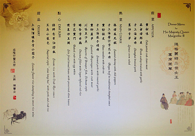 2014年4月27日21点30分丹麦女王在上海蟹王府九江路店用餐家宴菜单如下