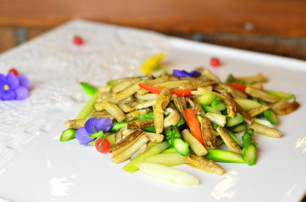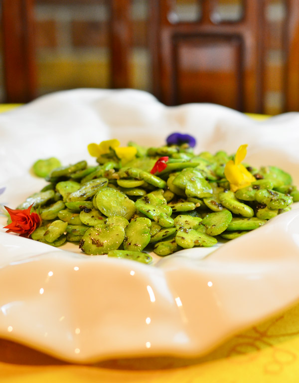 Stir fried broad beans withpreserved olive leaves
