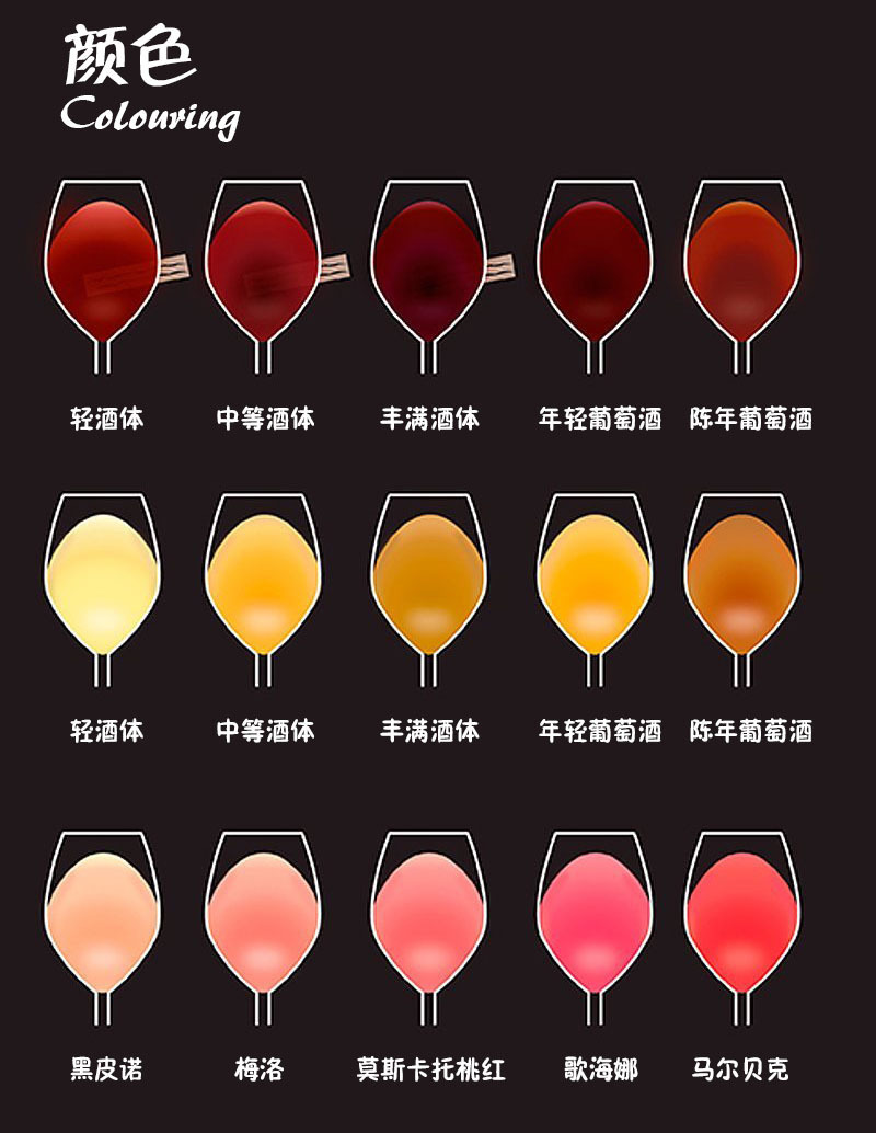 笼统地说,葡萄酒按颜色可以分为红葡萄酒、桃红葡萄酒和白葡萄酒。不过实际上,不同的红葡萄酒往往在色泽上有些微差异;即使是同一款酒,年轻的时候和陈年之后的颜色也不一样;桃红、白葡萄酒也都这样。