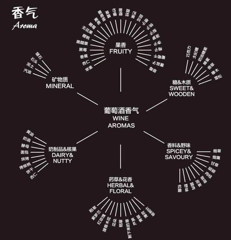 葡萄酒的香气非常复杂精妙,多姿多彩,包括果香、花香、香料香、药草香和矿物质香气等等。