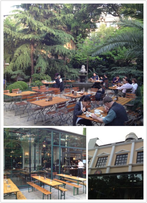是栋小洋房、带个很大的花园,非常迷人。露天的座位大部分是木桌及木椅,只有一旁有几张沙发,可以悠闲的坐着,可惜的是现酿的扎啤只有青岛及虎牌两种,其他的都是进口瓶装啤,到处都可以喝到。在安亭路上也有另一家分店。