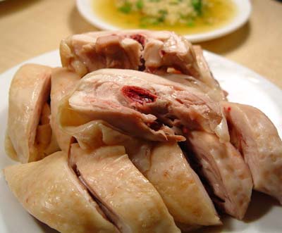 ②将鸡洗净,放水中净煮,中间提出两次,倒出腔中的水,以保持内外温度一致。约浸十五分钟至熟,用铁钩勾起,再放在冷开水中浸没冷却,并洗去绒毛、黄衣,随即捞起。焖着十分钟,晾干表皮,扫上熟花生油,斩成小块,盛入碟中,摆成鸡形。以斩出来的鸡块骨髓带血为适,斩件后,点着调料吃。