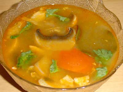 冬菇丝、再煮沸后,将鱼肉同蛋黄、豆腐原汁落锅,加酱油、精盐、醋搅匀,起