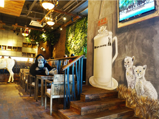 Zoo Coffee是一家以清新、回归自然为主调的特色咖啡店,在首尔第一家店正式开业以来已有200多家分店,凭借着动物园文化与咖啡厅文化的巧妙结合,吸引了众多慕名而来的顾客。最近,Zoo Coffee来到了上海,走进咖啡店犹如迈入了一片热带雨林,5米多高的长颈鹿站在小店进口处,墙壁上用水彩画着狮子、猫头鹰、大象等动物,顾客就餐用的区域环绕着各种芭蕉叶清新植物装饰作点缀,就像坐在大自然雨林树屋里喝咖啡一样,墙壁上多媒体放映时不时还听到各种动物的叫声令顾客身临其境,童趣而又充满艺术感。