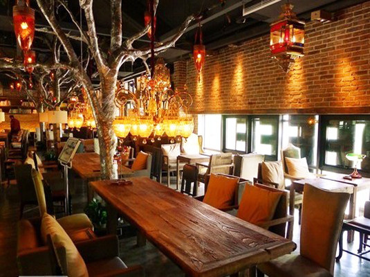 Maan cafe开在韩国人聚集地的金汇路上,沿街独栋的2层木质结构的木屋,露天一长溜被花草环绕的木质桌椅和遮阳伞,宣告着这里有家很可爱的咖啡馆。店内灯光氤氲很有情调,裸露的砖墙配合舒适的沙发,还有满墙的书籍,整体设计非常的时髦别致。店内还有很多沧桑的枯树枝,垂挂着一串串梦幻的水晶灯,又增添了些许童话气氛。这里的食物性价比也很高,色拉吐司三明治还有华夫冰激凌等,点套餐还可以加上咖啡或者其他鲜榨果汁,也不过40到50元,尤其推荐华夫套餐,满满4大块夯实的华夫,充满了浓浓的蛋香,配合蜂蜜或者冰激凌,非常甜美。
