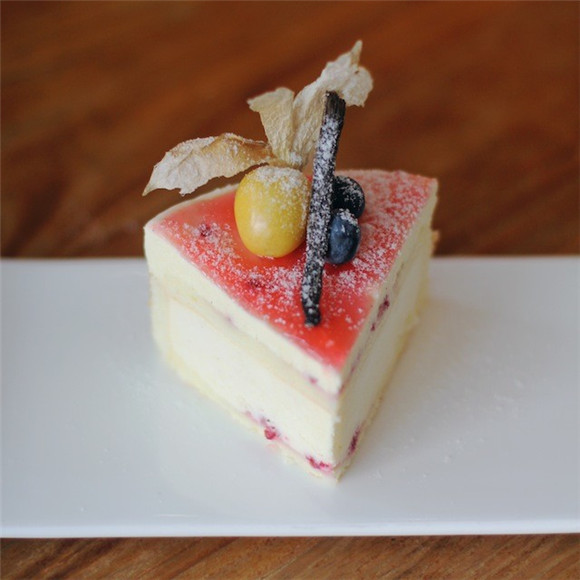 眼前这款水果蛋糕并没有遵循传统夏洛特的做法。手指饼干铺在了蛋糕里作分层用;覆盆子果粒混合在了香草奶油酱中,果味浓郁。最重要的是,不甜,且清凉柔软,甚至有些冰淇淋的口感。