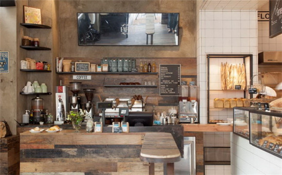 Farine 水泥墙面和旧木材制作的柜台,让人有法国乡村的感觉,室外的长条木桌是客人交流的好场所