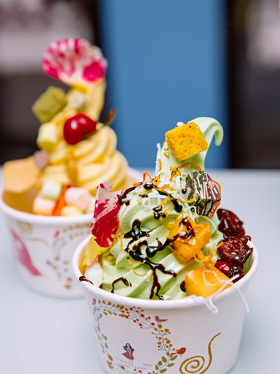 在这个小型冰激凌梦工厂车间,咸焦糖味、提拉米苏味、椰子味等8种独具匠心不同口味的软式冰激凌从“水龙头”里流出,抹茶口味冰淇淋尤为出彩,浓郁清香,看着就很诱人!此外,还有近四十多种不同配料可DIY搭配,顾客可以制作出一杯代表自己个性的冰激凌。值得一提的是,冰激凌店还将下午茶糕点元素融入配料中,甜蜜瞬间涌上心头。