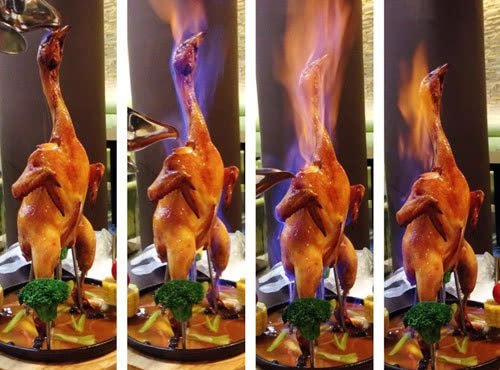 “侏罗纪鸡”一上桌,视觉非常震撼,雄赳赳站立的造型,浇上酒点着火,霸气十足,的确有点恐龙的影子。据说,这道菜是大厨十年前研制出来的,灵感正是从电影《侏罗纪公园》获取。为保证入味,鸡要放进秘制卤水里腌制18个小时,然后把腌好的鸡放入烤炉里吊烤风干12个小时,层层工序才能达到皮脆肉嫩、鲜香无比的口感。最后上桌时,点火助燃,让食客们在吃之前先享受一顿视觉盛宴。