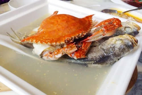 这“八仙过海”里有八种海鲜,分别是黄鱼、澳洲带子、蛏子、文蛤、梭子蟹、基围虾、乌鱼蛋和九肚鱼,再加上秘制的海鲜高汤蒸煮,把节瓜打成蓉放入汤中,用特有的清香味为海鲜汤提鲜。焯过水的海鲜和节瓜汤在一起蒸煮20分钟左右,这道八仙过海就能上桌了。