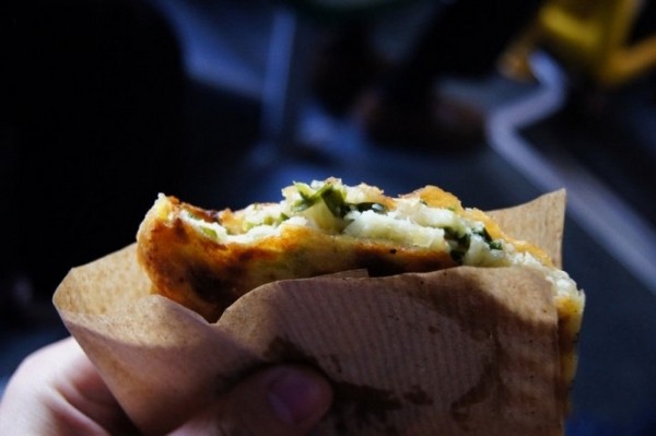 阿大葱油饼久负盛名。老板阿大先是将葱油饼两面煎,然后放炉子上烤,这样才能做出外皮薄脆,内在香软,葱油香浓郁悠长的煎饼。