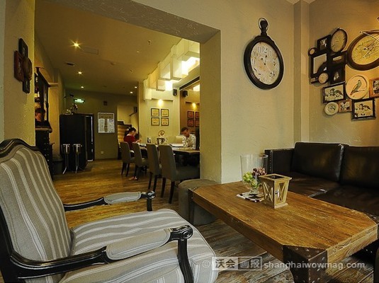 挂钟、相框和柔和的灯光,和那颇为古朴的原木桌子,让人感觉舒适和放松