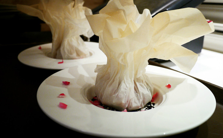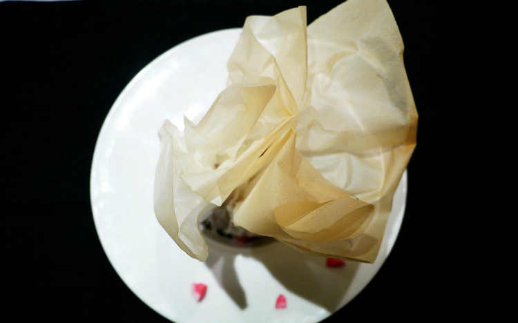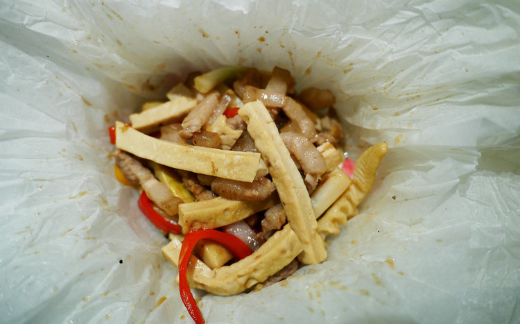 这道菜上来的时候被包得严严实实,好奇究竟是什么打开之后得见真身,特别之处是选用了来自贵州的青岩豆腐,肉丝用油过一次之后和豆腐、红椒、笋快炒,再用油纸包住放到烤箱里焗一遍。