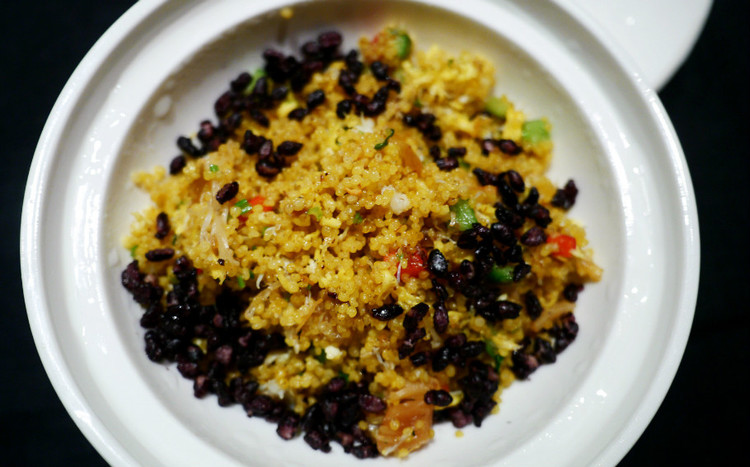 贵州小米、手工撕成丝状的瑶柱、炸过的黑米、自制的剁椒料、蟹肉和青椒粒制成的炒饭,金黄色的小米炒饭,看看卖相就很不错。