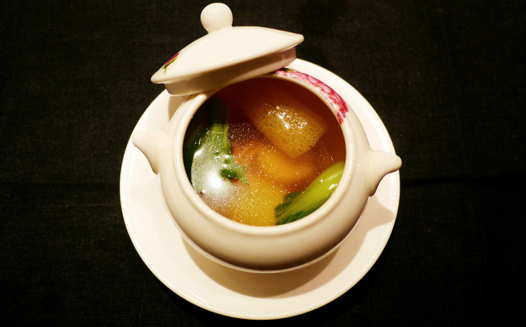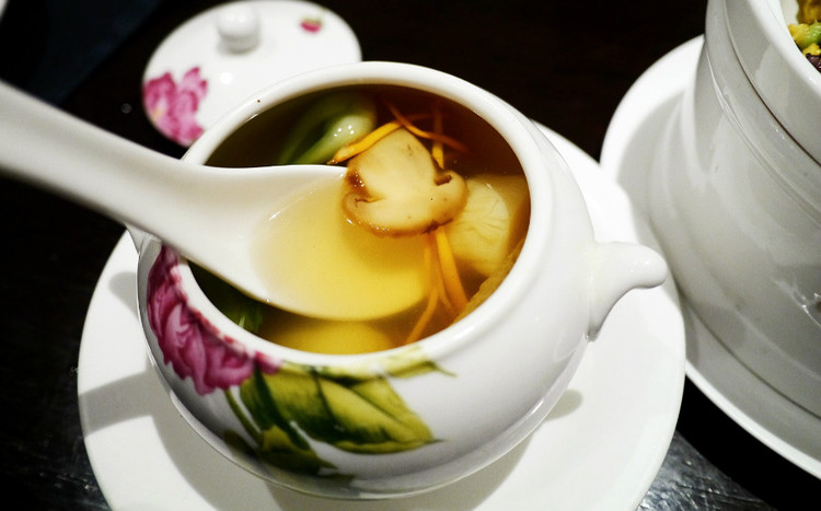 完全蒸出来的汤,松茸、虫草花、鸽子蛋、瑶柱,用料十足、色泽清爽,汤的鲜甜完全将食材的精华展现出来了,喝下去感觉就是满满的营养。
