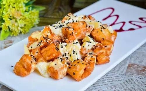 还是粤菜!而且还是道名菜!!油条段包上虾仁,和菠萝扮在一起,浇上色拉酱,再点缀些芝麻,就是这道充满流行Fusion风的菠萝油条虾。香甜的菠萝爽脆微酸,外皮酥脆金黄的油条裹上Q嫩鲜虾,对撞口感充满新鲜,菠萝的鲜甜中和了油条的腻度,酸甜口味又让人胃口大开!口味偏甜的童鞋们,蛮好试试这道额~
