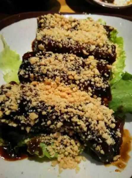 发朋友圈一定弹眼落睛!乍看像排骨,绝对没人能猜得出这!是!油!条!传统八宝油条是在油条里塞满八宝辣酱,这一道却是将老油条炸至酥透,再在外层裹满厚厚的八宝酱汁。浓油赤酱的味道充满本帮风情,每晚22:00后限量供应,去得太早也是吃不到哦~
